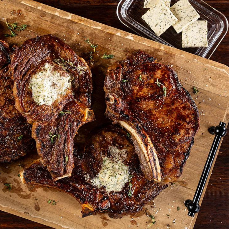 A 20–22?oz bone-in ribeye, wet-aged and handed to you in a set of four, with Sergio’s seasoning and house-made compound butter.