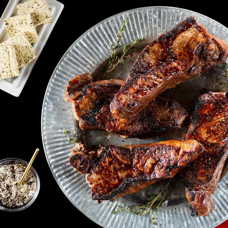 Start on a hot cast-iron skillet or grill, sear 4–5 minutes per side to medium-rare, then rest. Season with Sergio’s, finish with Maitre d’ Butter, garlic, rosemary—their recommended flavor kit.