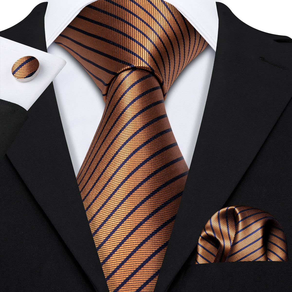 Stripes have long been a menswear staple, but in 2025, expect them to get bolder, brighter, and more expressive. No longer confined to just navy or grey, stripes now come in vivid hues and unexpected color combos—like burnt orange, teal, and gold—injecting energy into your formalwear.Orange Stripe Tie Set. If you're ready to embrace color, this tie is a must-have. Featuring vibrant orange stripes offset by sleek black accents, it's perfect for occasions where personality and polish go hand-in-hand. The smooth silk texture enhances the visual pop, while the matching accessories tie the look together—pun intended.